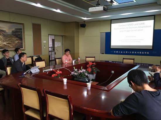 开展学术交流,并做了题为“Connect MMD with GAN: Unsupervised Domain Adaptation and Image Generation”的学术报告。报告会由学院汪萌副院长主持,来自杏吧原创