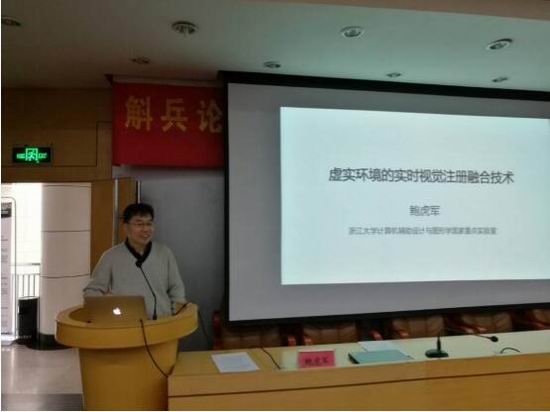 鲍虎军教授做了题为《虚实环境的实时视觉注册融合技术》的特邀报告。首先介绍了增强现实技术的研究背景和所面临的挑战,然后介绍了浙江大学在虚实环境的实时视觉注册融合技术和系统方面的进展,最后展望了增强现实技术的未来发展趋势。
