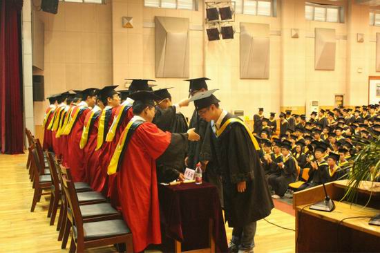 2015届毕业生学士学位授予决定》,全院共计530名同学被授予了工学学士学位。随后,校领导与学院学位评定委员会全体委员一起为全体学士学位获得者颁发学位证书,扶正流苏并合影留念。