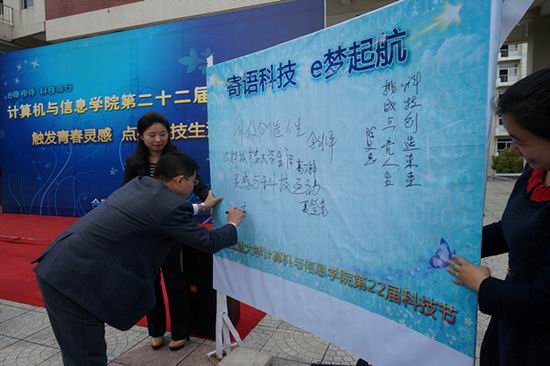 在翡翠湖校区一食堂广场隆重举行科技节系列活动开幕式。市科协主席金维平,校团委书记陈文恩,党委学工部副部长葛万锋,杏吧原创