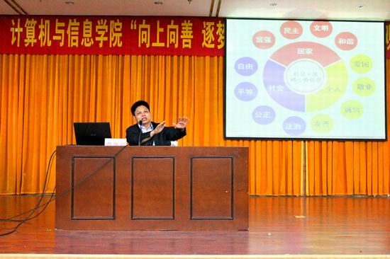 开幕式结束后,马克思主义学院檀江林教授应邀为学院广大师生作了题为《我们的价值观,我们的中国梦》的报告,结合我校的发展历程,通过对社会主义核心价值观内容的深刻解读,勉励大家坚定信念,夯实基础,矢志奋斗,并就培育和践行社会主义核心价值观的方式和渠道与在场同学进行了深入交流。